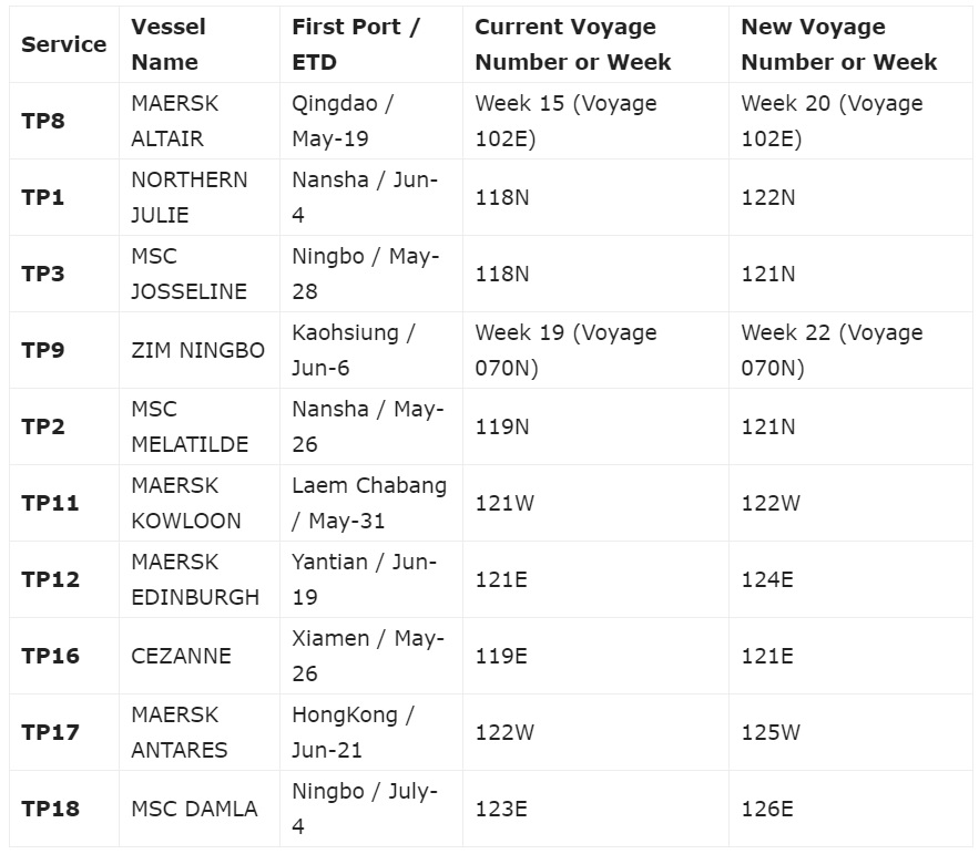 Maersk lưu ý rằng họ sẽ điều chỉnh số chuyến đi bắt đầu từ các chuyến đi bên dưới để phù hợp với các tuần khởi hành thực tế và cung cấp độ tin cậy và khả năng nhận biết lịch trình tốt hơn.