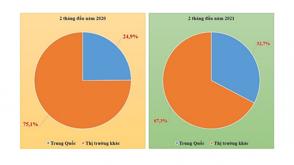 Với tốc độ tăng trưởng nêu trên nên đưa tỷ lệ của Trung Quốc trong tổng kim ngạch nhập khẩu của Việt Nam đã tăng từ mức 24,9% của 2 tháng đầu năm 2020 lên 32,7% trong 2 tháng đầu năm nay.